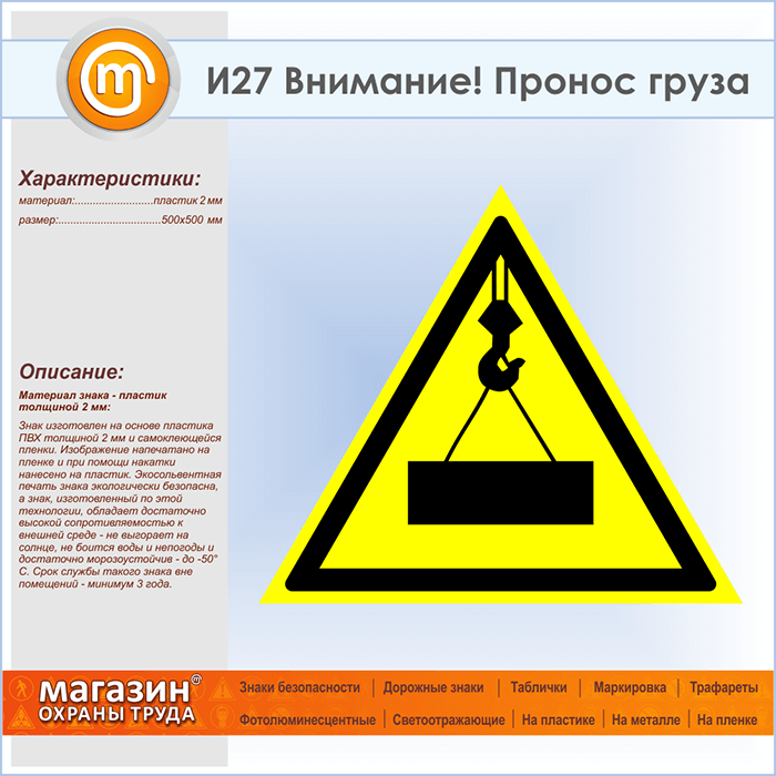 Знак «Внимание! Пронос груза», И27 (пластик, сторона 500 мм) в Великом Новгороде купить