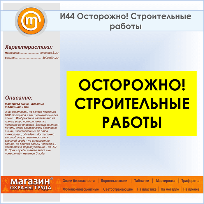 Знак «Осторожно! Строительные работы», И44 (пластик, 800х400 мм) в Великом Новгороде купить