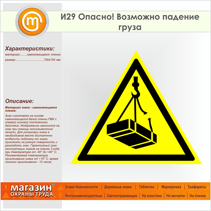 Знак «Опасно! Возможно падение груза», И29 (пленка, сторона 700 мм) в Великом Новгороде купить