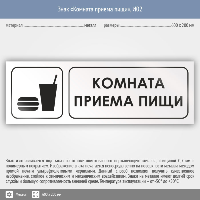 Знак «Комната приема пищи», И02 (металл, 600х200 мм) в Великом Новгороде купить