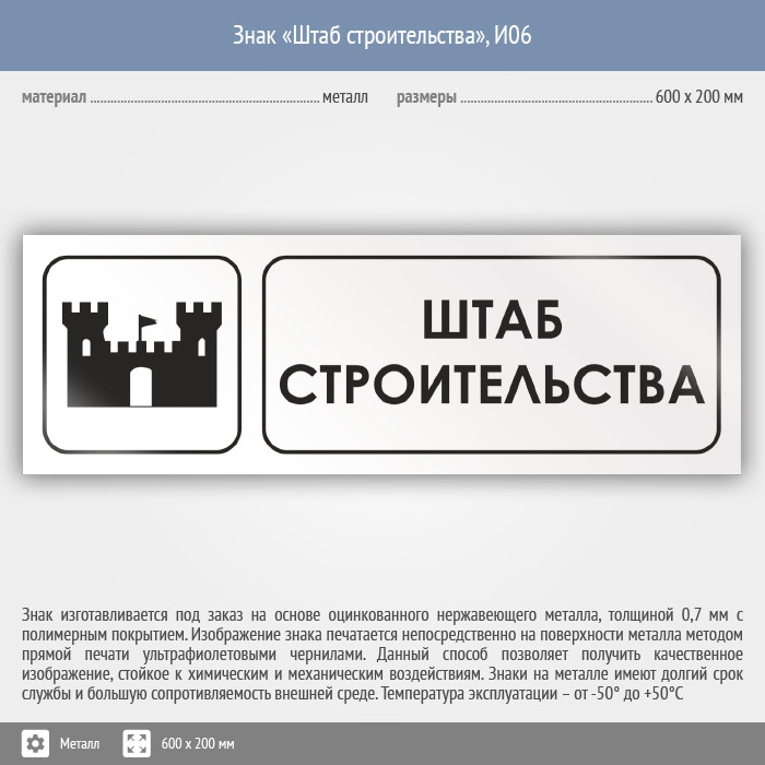 Знак «Штаб строительства», И06 (металл, 600х200 мм) в Великом Новгороде купить