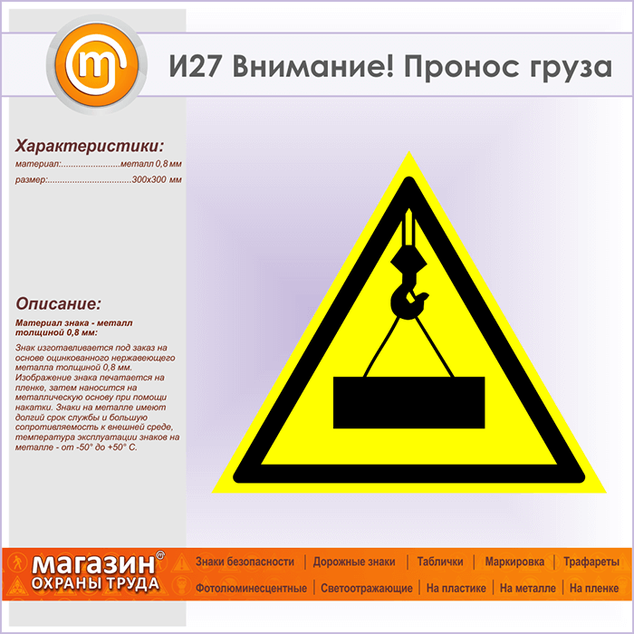 Знак «Внимание! Пронос груза», И27 (металл, сторона 300 мм) в Великом Новгороде купить