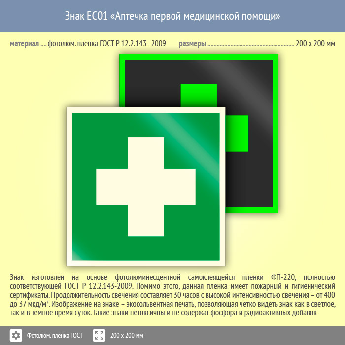 Знак EC01 «Аптечка первой медицинской помощи» (фотолюминесцентная пленка ГОСТ 34428-2018, 200х200 мм) в Великом Новгороде купить