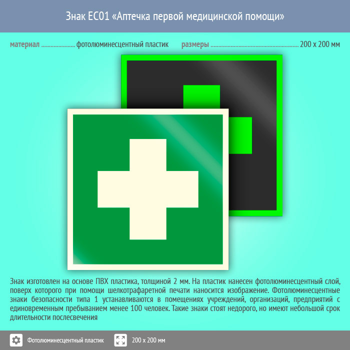 Знак EC01 «Аптечка первой медицинской помощи» (фотолюминесцентный пластик, 200х200 мм) в Великом Новгороде купить