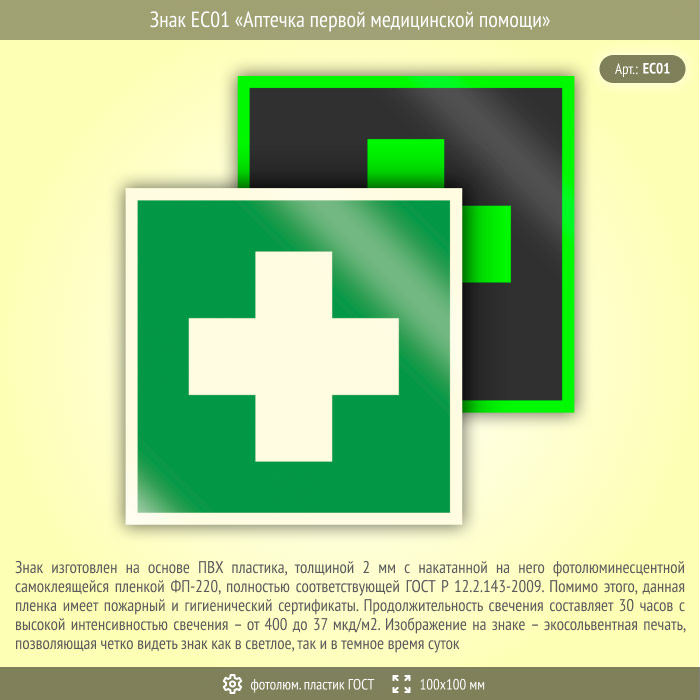 Знак EC01 «Аптечка первой медицинской помощи» (фотолюминесцентный пластик ГОСТ 34428-2018, 100х100 мм) в Великом Новгороде купить