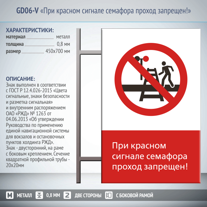 Знак «При красном сигнале семафора проход запрещен!», GD06-V (двусторонний вертикальный, 450х700 мм, металл, на раме с боковым креплением) в Великом Новгороде купить