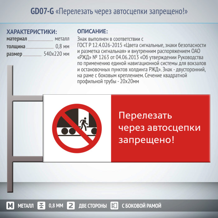 Знак «Перелезать через автосцепки запрещено!», GD07-G (двусторонний горизонтальный, 540х220 мм, металл, на раме с боковым креплением) в Великом Новгороде купить