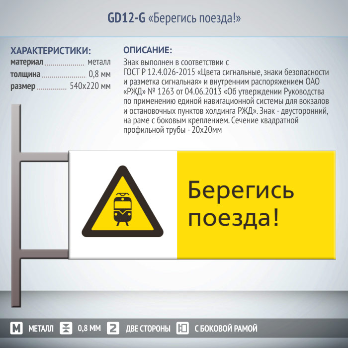 Знак «Берегись поезда!», GD12-G (двусторонний горизонтальный, 540х220 мм, металл, на раме с боковым креплением) в Великом Новгороде купить