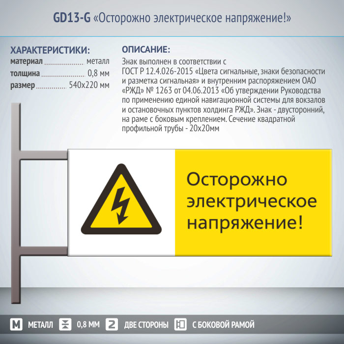 Знак «Осторожно электрическое напряжение!», GD13-G (двусторонний горизонтальный, 540х220 мм, металл, на раме с боковым креплением) в Великом Новгороде купить