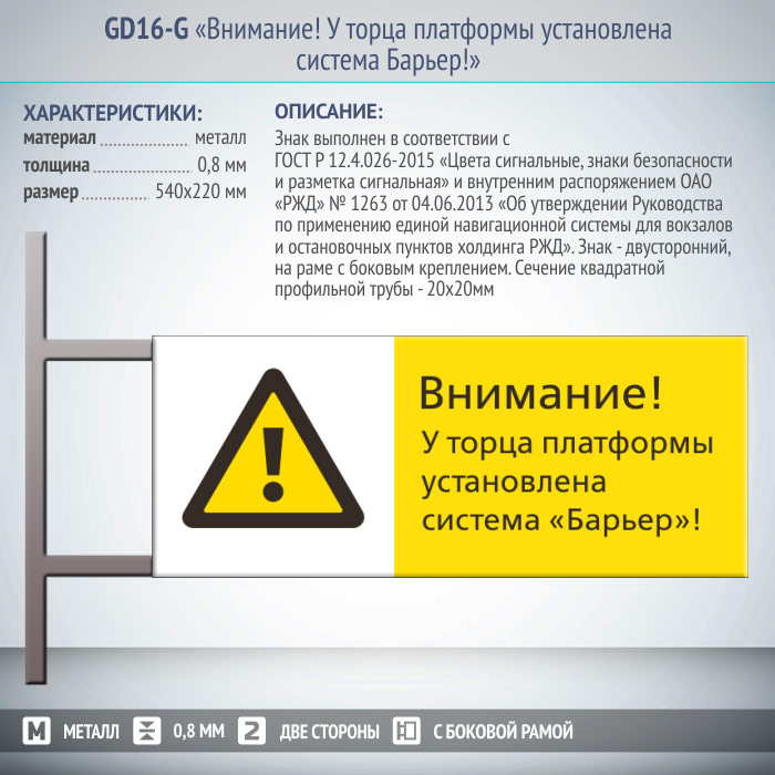 Знак «Внимание! У торца платформы установлена система Барьер!», GD16-G (двусторонний горизонтальный, 540х220 мм, металл, на раме с боковым креплением) в Великом Новгороде купить