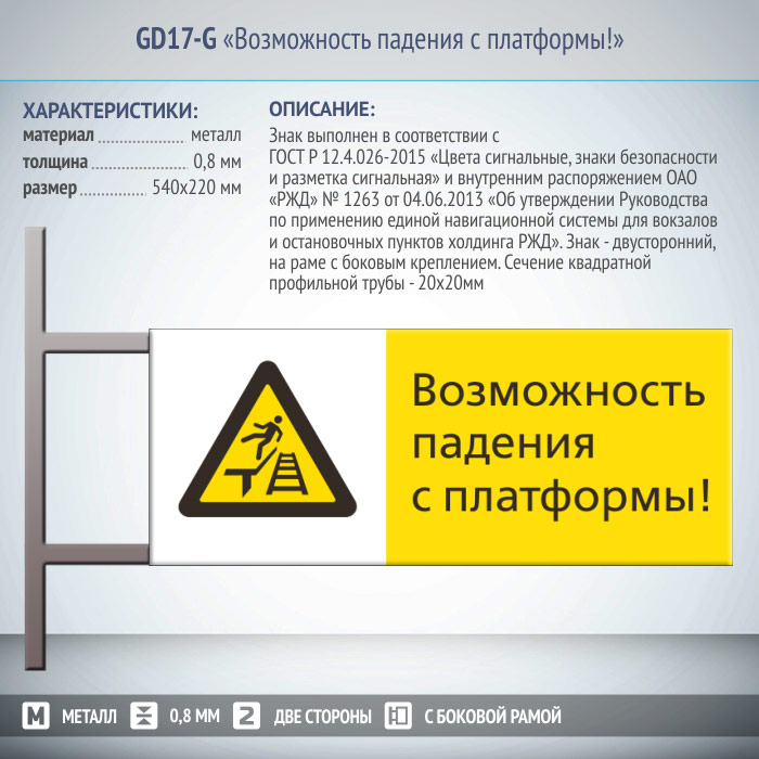 Знак «Возможность падения с платформы!», GD17-G (двусторонний горизонтальный, 540х220 мм, металл, на раме с боковым креплением) в Великом Новгороде купить