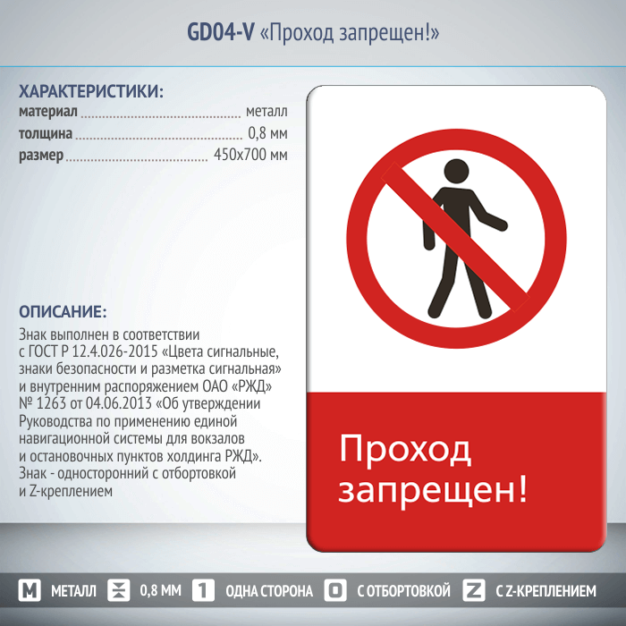 Знак «Проход запрещен!», GD04-V (односторонний вертикальный, 450х700 мм, металл, с отбортовкой и Z-креплением) в Великом Новгороде купить