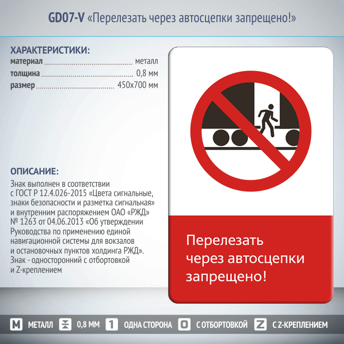 Знак «Перелезать через автосцепки запрещено!», GD07-V (односторонний вертикальный, 450х700 мм, металл, с отбортовкой и Z-креплением) в Великом Новгороде купить