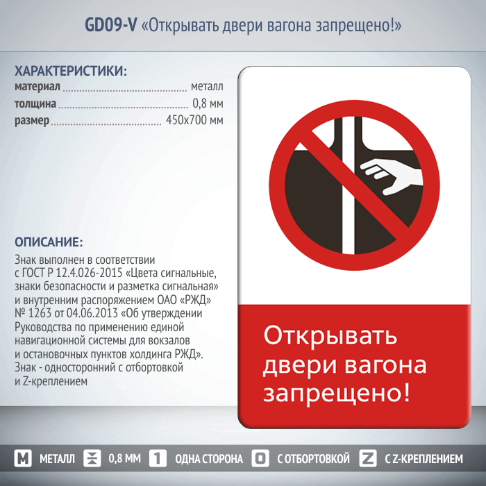 Знак «Открывать двери вагона запрещено!», GD09-V (односторонний вертикальный, 450х700 мм, металл, с отбортовкой и Z-креплением) в Великом Новгороде купить