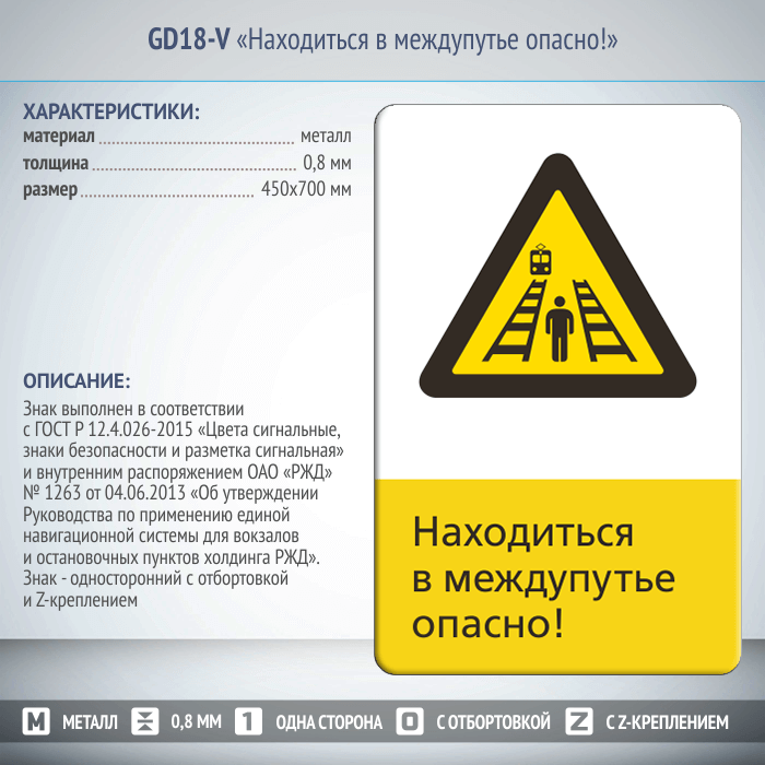 Знак «Находиться в междупутье опасно!», GD18-V (односторонний вертикальный, 450х700 мм, металл, с отбортовкой и Z-креплением) в Великом Новгороде купить