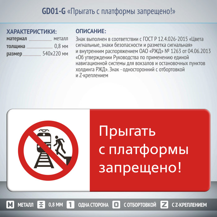 Знак «Прыгать с платформы запрещено!», GD01-G (односторонний горизонтальный, 540х220 мм, металл, с отбортовкой и Z-креплением) в Великом Новгороде купить