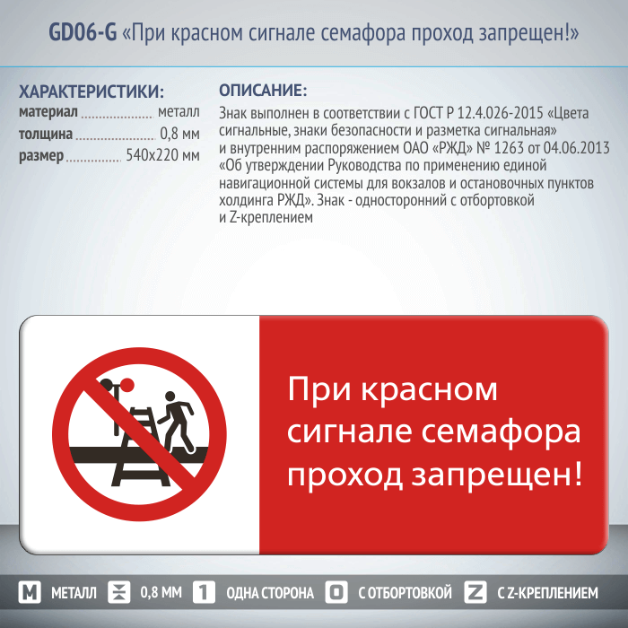 Знак «При красном сигнале семафора проход запрещен!», GD06-G (односторонний горизонтальный, 540х220 мм, металл, с отбортовкой и Z-креплением) в Великом Новгороде купить