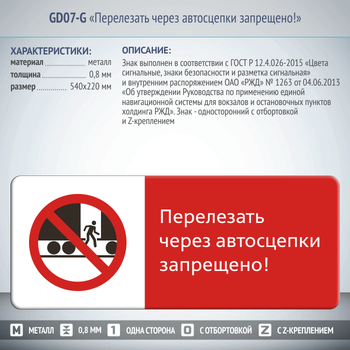 Знак «Перелезать через автосцепки запрещено!», GD07-G (односторонний горизонтальный, 540х220 мм, металл, с отбортовкой и Z-креплением) в Великом Новгороде купить