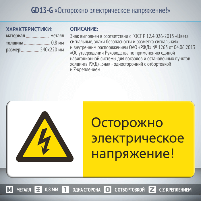 Знак «Осторожно электрическое напряжение!», GD13-G (односторонний горизонтальный, 540х220 мм, металл, с отбортовкой и Z-креплением) в Великом Новгороде купить