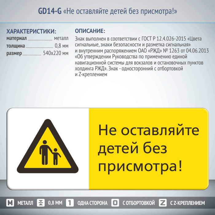 Знак «Не оставляйте детей без присмотра!», GD14-G (односторонний горизонтальный, 540х220 мм, металл, с отбортовкой и Z-креплением) в Великом Новгороде купить