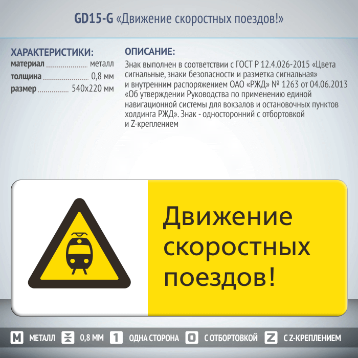 Знак «Движение скоростных поездов!», GD15-G (односторонний горизонтальный, 540х220 мм, металл, с отбортовкой и Z-креплением) в Великом Новгороде купить