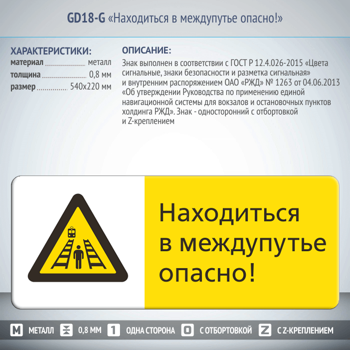 Знак «Находиться в междупутье опасно!», GD18-G (односторонний горизонтальный, 540х220 мм, металл, с отбортовкой и Z-креплением) в Великом Новгороде купить