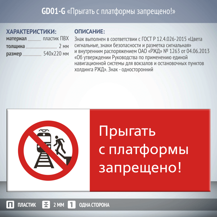 Знак «Прыгать с платформы запрещено!», GD01-G (односторонний горизонтальный, 540х220 мм, пластик 2 мм) в Великом Новгороде купить