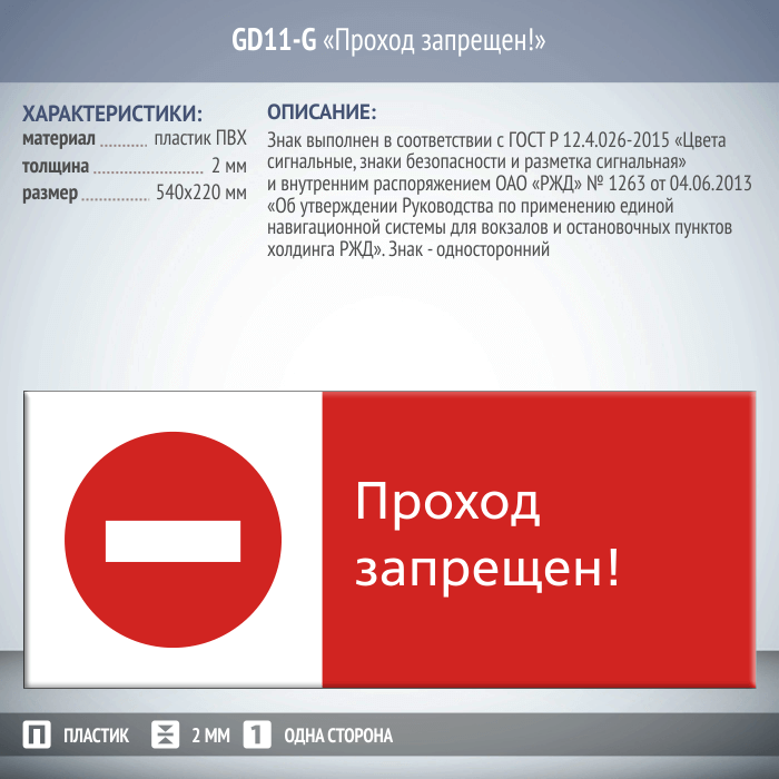 Знак «Проход запрещен!», GD11-G (односторонний горизонтальный, 540х220 мм, пластик 2 мм) в Великом Новгороде купить