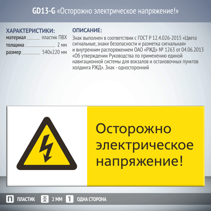 Знак «Осторожно электрическое напряжение!», GD13-G (односторонний горизонтальный, 540х220 мм, пластик 2 мм) в Великом Новгороде купить