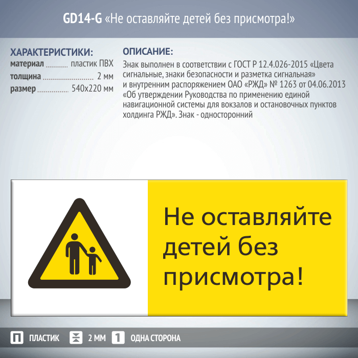 Знак «Не оставляйте детей без присмотра!», GD14-G (односторонний горизонтальный, 540х220 мм, пластик 2 мм) в Великом Новгороде купить