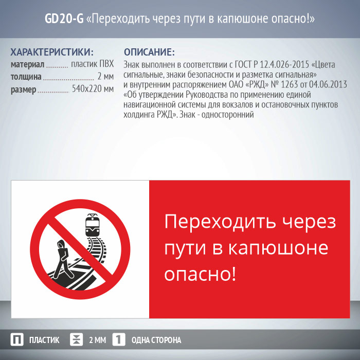 Знак «Переходить через пути в капюшоне опасно!», GD20-G (односторонний горизонтальный, 540х220 мм, пластик 2 мм) в Великом Новгороде купить