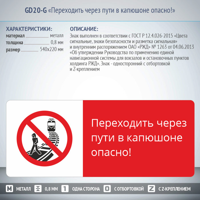 Знак «Переходить через пути в капюшоне опасно!», GD20-G (односторонний горизонтальный, 540х220 мм, металл, с отбортовкой и Z-креплением) в Великом Новгороде купить
