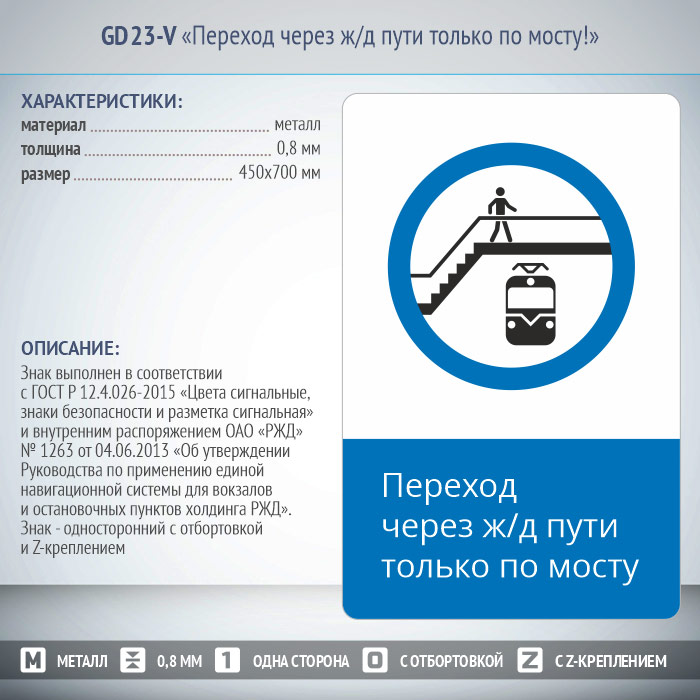 Знак «Переход через ж/д пути только по мосту!», GD23-V (односторонний вертикальный, 450х700 мм, металл, с отбортовкой и Z-креплением) в Великом Новгороде купить