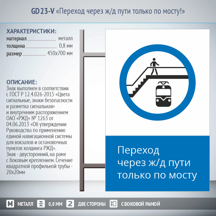 Знак «Переход через ж/д пути только по мосту!», GD23-V (двусторонний вертикальный, 450х700 мм, металл, на раме с боковым креплением) в Великом Новгороде купить