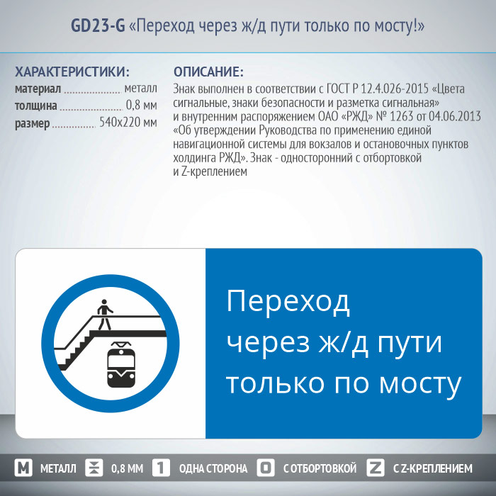 Знак «Переход через ж/д пути только по мосту!», GD23-G (односторонний горизонтальный, 540х220 мм, металл, с отбортовкой и Z-креплением) в Великом Новгороде купить