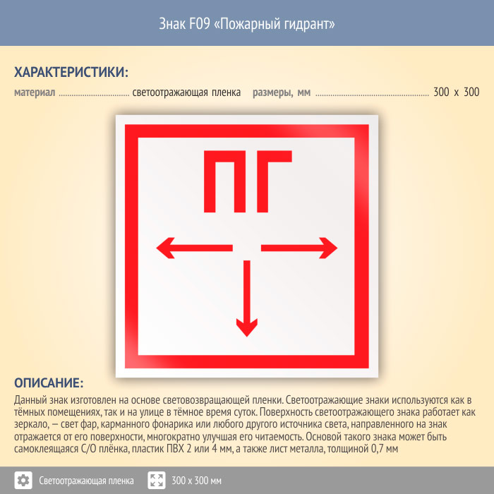 Знак F09 «Пожарный гидрант» (светоотражающая пленка, 300х300 мм) в Великом Новгороде купить