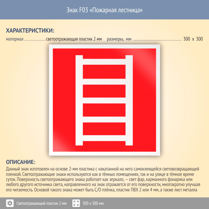Знак F03 «Пожарная лестница» (светоотражающий пластик, 300х300 мм) в Великом Новгороде купить