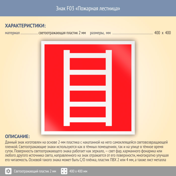 Знак F03 «Пожарная лестница» (светоотражающий пластик, 400х400 мм) в Великом Новгороде купить