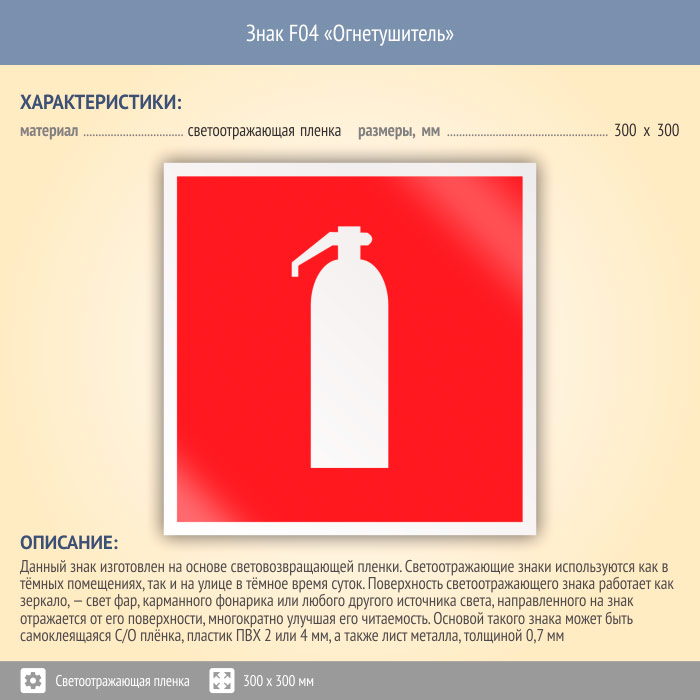 Знак F04 «Огнетушитель» (светоотражающая пленка, 300х300 мм) в Великом Новгороде купить
