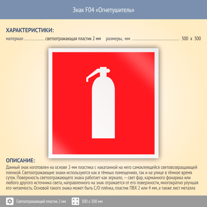 Знак F04 «Огнетушитель» (светоотражающий пластик, 300х300 мм) в Великом Новгороде купить