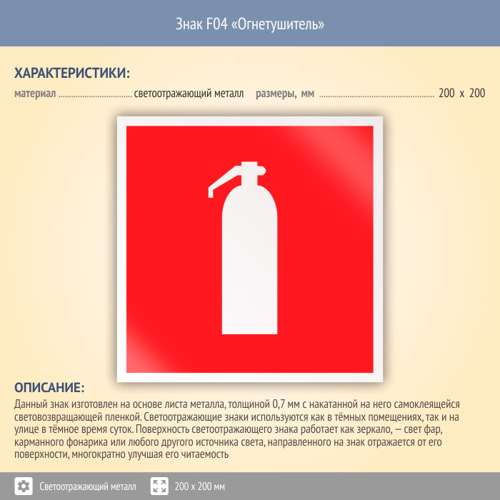 Знак F04 «Огнетушитель» (светоотражающий металл, 200х200 мм) в Великом Новгороде купить