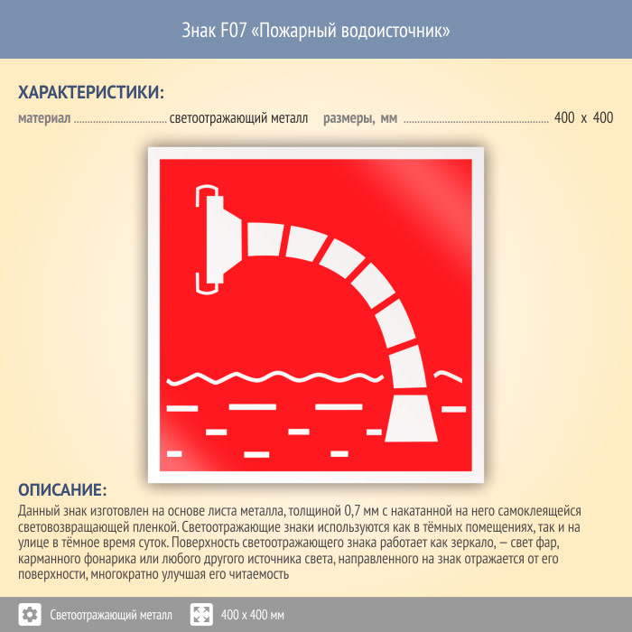 Знак F07 «Пожарный водоисточник» (светоотражающий металл, 400х400 мм) в Великом Новгороде купить