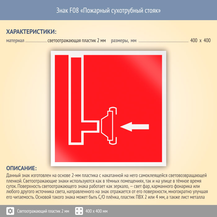 Знак F08 «Пожарный сухотрубный стояк» (светоотражающий пластик, 400х400 мм) в Великом Новгороде купить