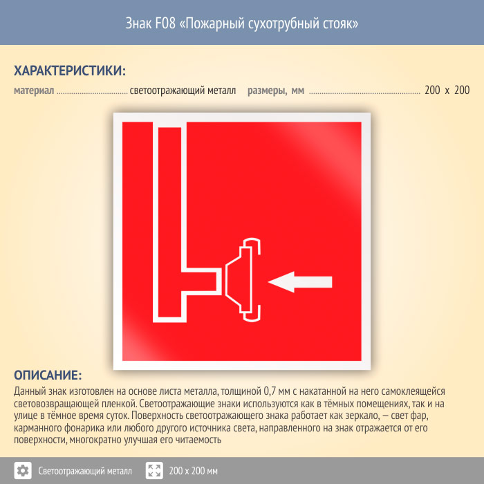 Знак F08 «Пожарный сухотрубный стояк» (светоотражающий металл, 200х200 мм) в Великом Новгороде купить