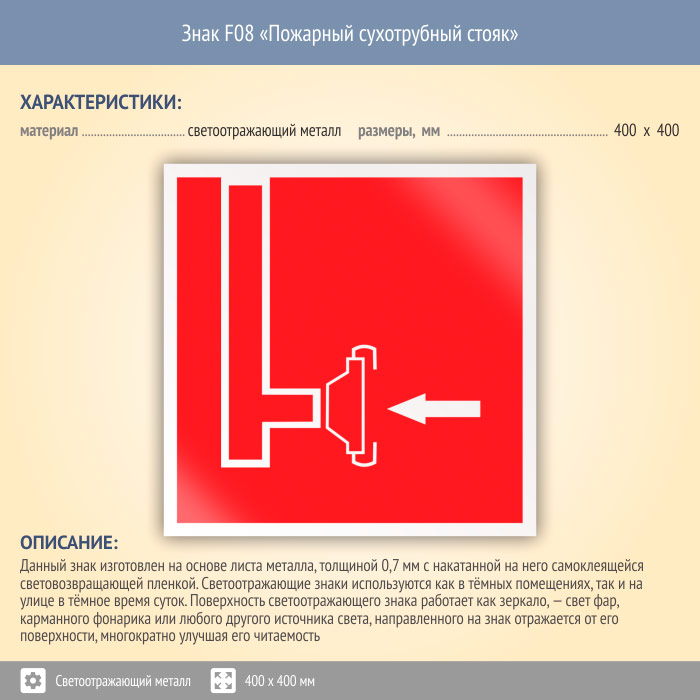 Знак F08 «Пожарный сухотрубный стояк» (светоотражающий металл, 400х400 мм) в Великом Новгороде купить
