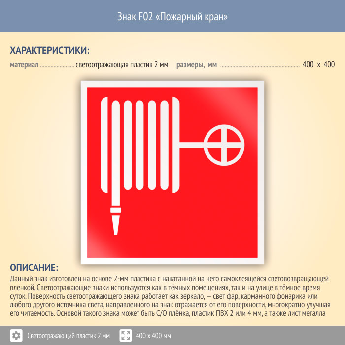 Знак F02 «Пожарный кран» (светоотражающий пластик, 400х400 мм) в Великом Новгороде купить