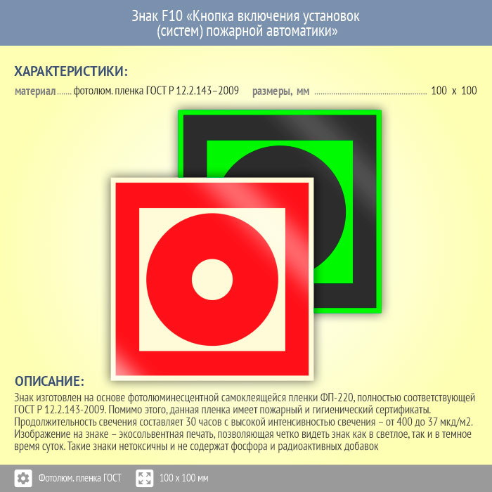 Знак F10 «Кнопка включения установок (систем) пожарной автоматики» (фотолюминесцентная пленка ГОСТ 34428-2018, 100х100 мм) в Великом Новгороде купить
