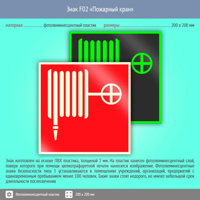Знак F02 «Пожарный кран» (фотолюминесцентный пластик, 200х200 мм) в Великом Новгороде купить