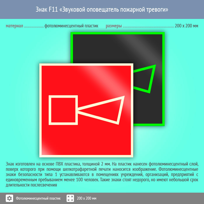 Знак F11 «Звуковой оповещатель пожарной тревоги» (фотолюминесцентный пластик, 200х200 мм) в Великом Новгороде купить