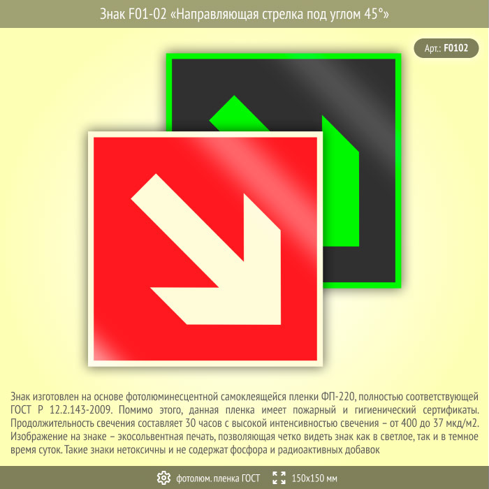 Знак F01-02 «Направляющая стрелка под углом 45°» (фотолюминесцентная пленка ГОСТ 34428-2018, 150х150 мм) в Великом Новгороде купить
